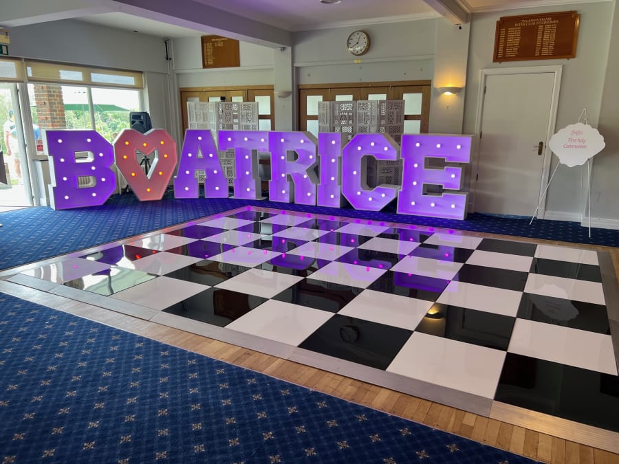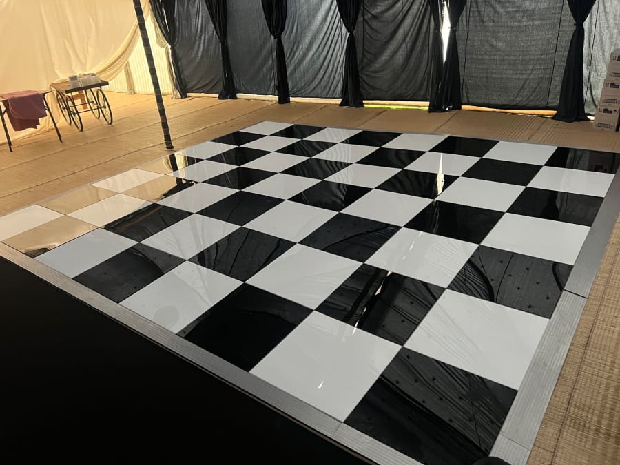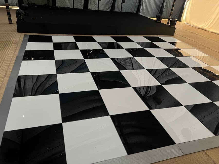Whether you're hosting an indoor gathering or an outdoor extravaganza, our versatile black and white chequered dance floor is the ideal centerpiece to create an enchanting atmosphere. The classic black-and-white design complements any décor, adding sophistication and style to your celebration. Plus, it’s easy to install and strong enough to handle even the liveliest parties.