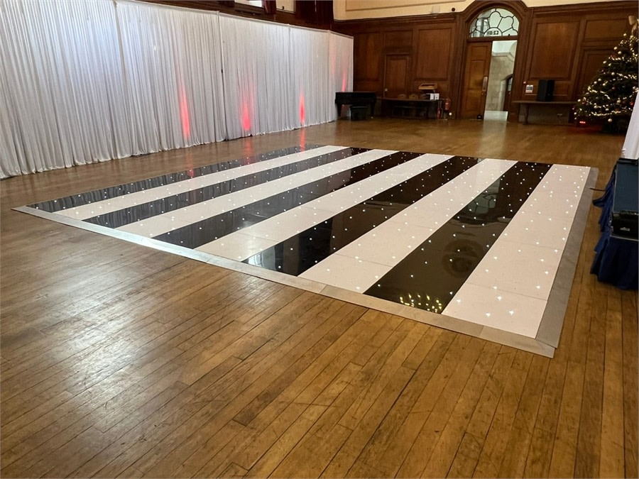 Our 12ft x 12ft Black & White Starlit Dance Floor is a striking and stylish centerpiece for any event. Combining high-gloss black and white panels with shimmering LED star effects, this floor delivers a bold visual impact that will wow your guests from the moment they arrive.
