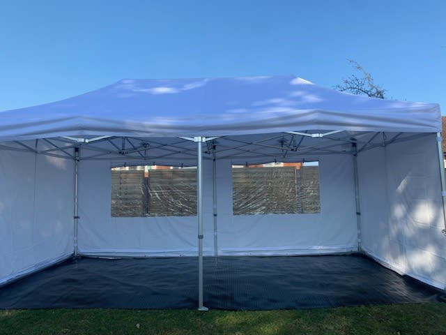 Our premium Marquees with non-slip rubber flooring are perfect for almost any event, measuring 3m x 6m x 2m high (approx 10ft x 20ft x 6.5ft high – External height 3.28m), ideal for around 20-30 people standing or 8m x 4m x 2m high (approx 13ft x 26ft x 6.5ft high – External height 3.9m), ideal for around 50 people standing.