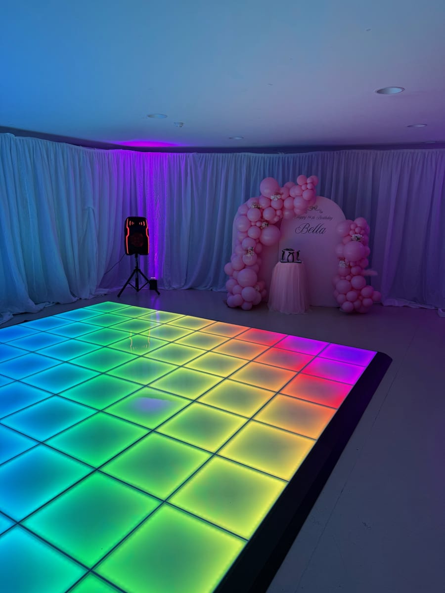 Customizable Sizes and Layouts We offer various sizes for our Retro Frosted LED Dance Floors, including square and rectangular options, and you can even add a stunning Retro walkway leading up to the dance floor to make a grand entrance for your guests.
