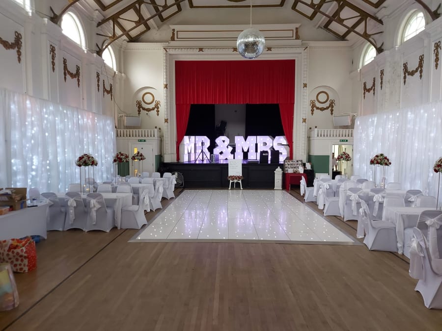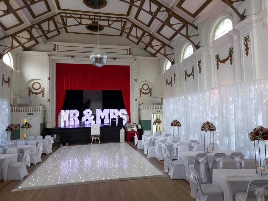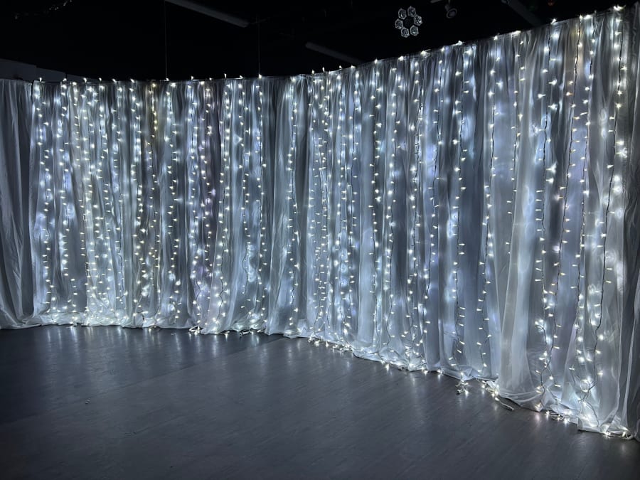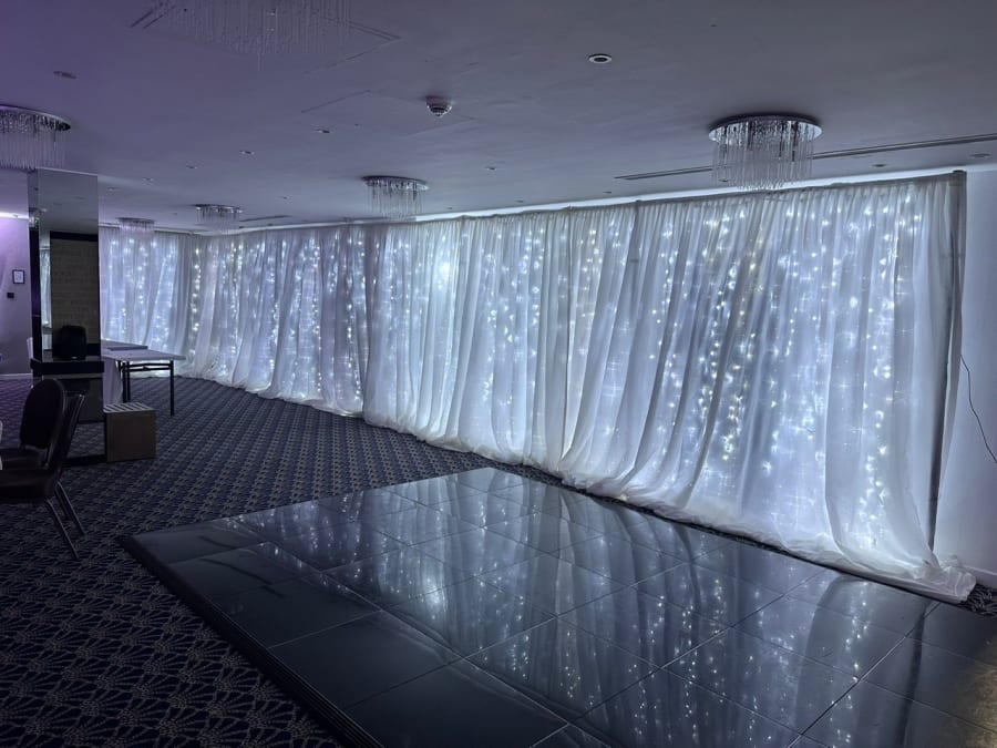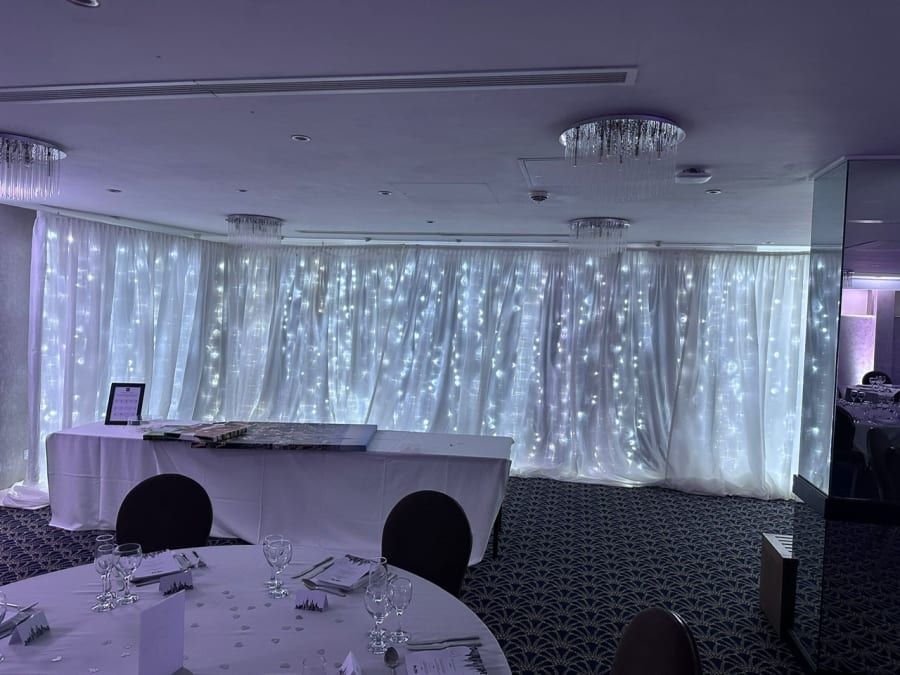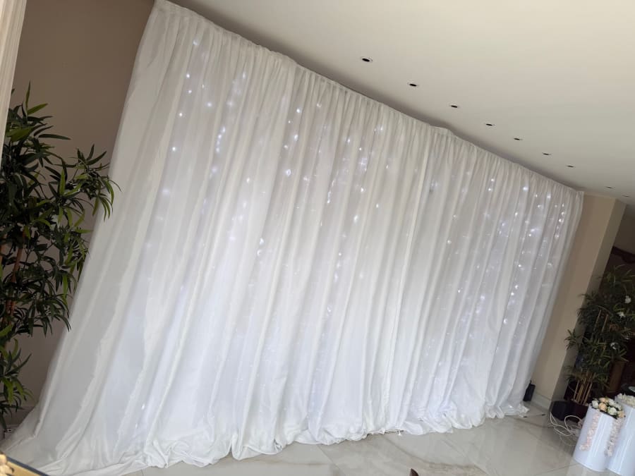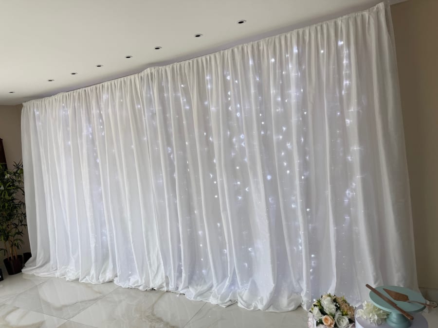 Our White Drapes, paired with LED fairy lights in warm white or bright white, offer the ultimate solution for transforming any event space. Whether you're looking to conceal areas that are less than ideal or create a stunning focal point, these elegant drapes provide a clean backdrop that can be illuminated to perfection. The LED fairy lights, placed in front or behind the drapes, create a magical lit backdrop that adds a touch of enchantment to your setting. Perfect for head tables, wedding ceremonies, parties, and corporate functions, our drapes can divide spaces, enhance ambiance, and delight your guests. When combined with accent colors and lighting effects, they act as a blank canvas, ready for you to create a personalized atmosphere. With our drapes and LED fairy lights, you can design a breathtaking masterpiece that elevates your venue into a truly memorable experience.
