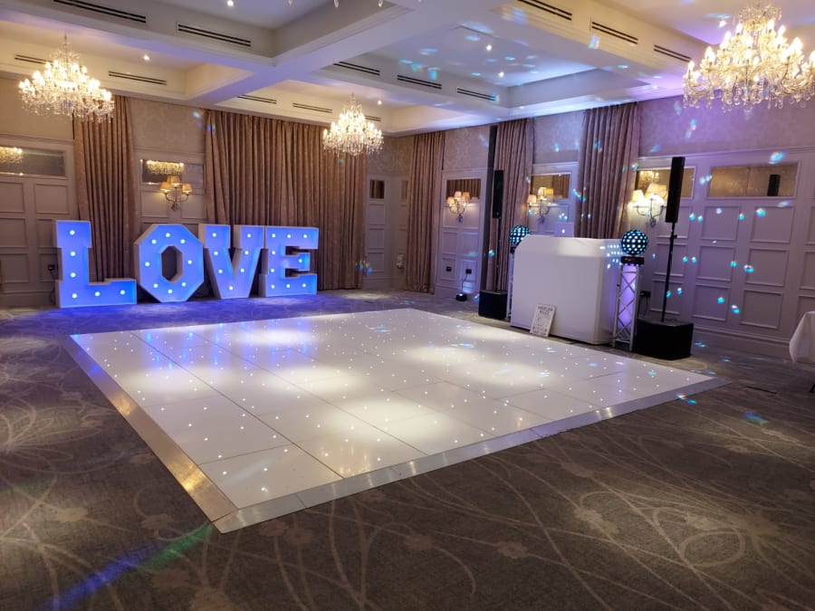 16ft x 16ft LED White Starlit Dance Floor – one of our larger and most impressive dance floors, offering plenty of space and a stunning visual centrepiece for your venue.