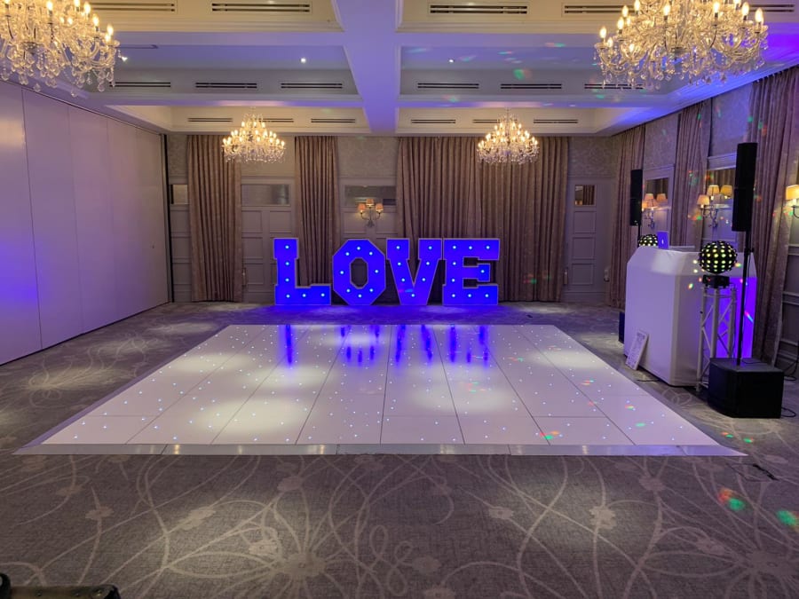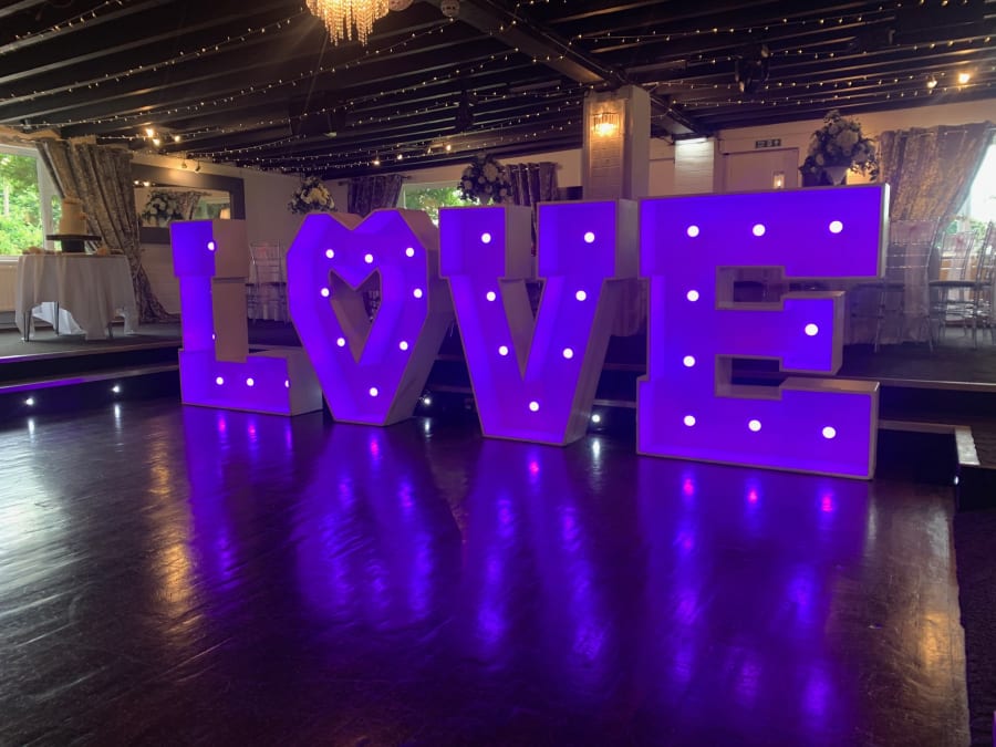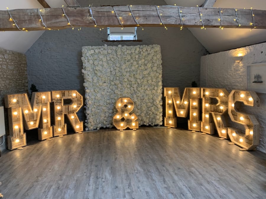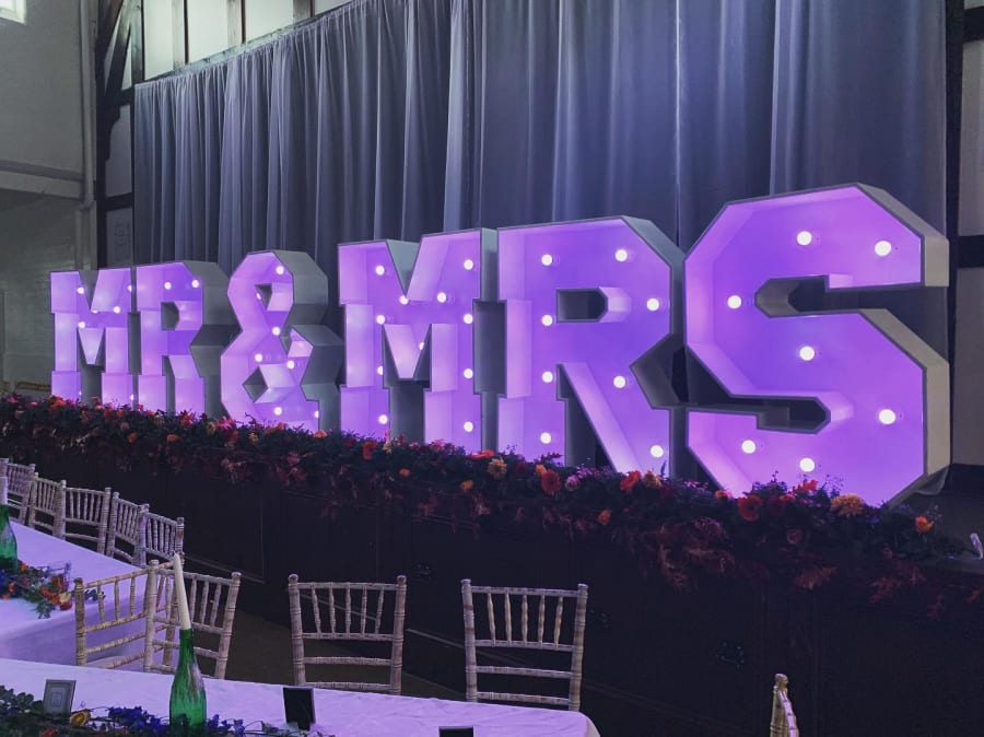 LED Letters (Up to 10 Characters) – Customise your setup with your choice of light-up letters, whether it’s LOVE, MR & MRS, a surname, initials, or a unique phrase.